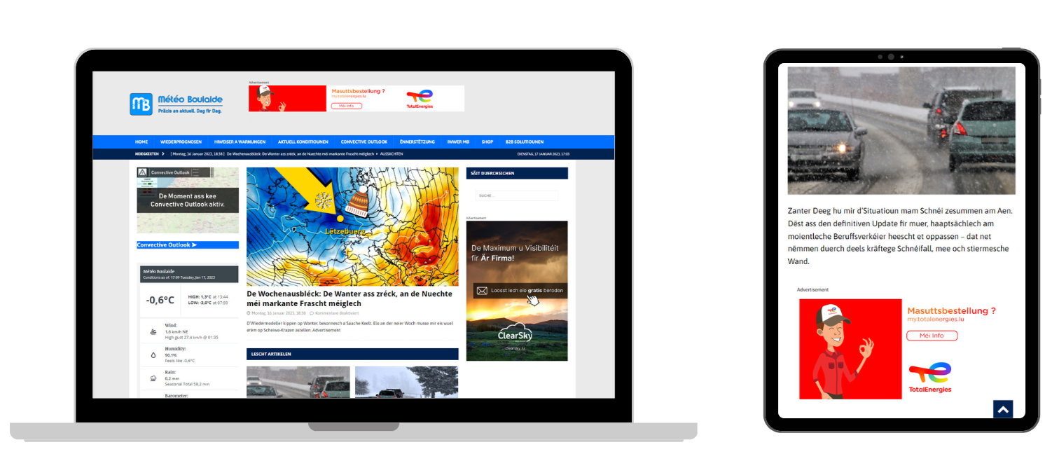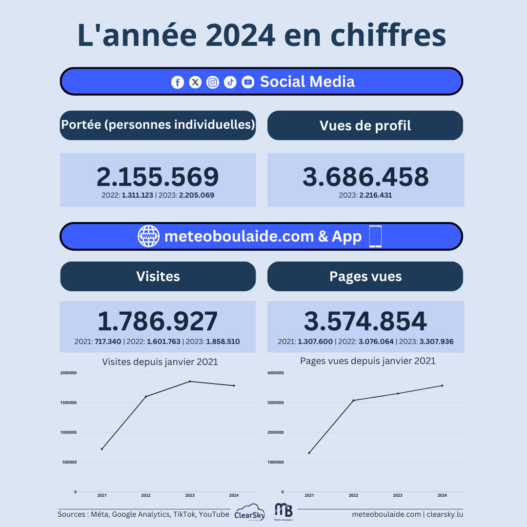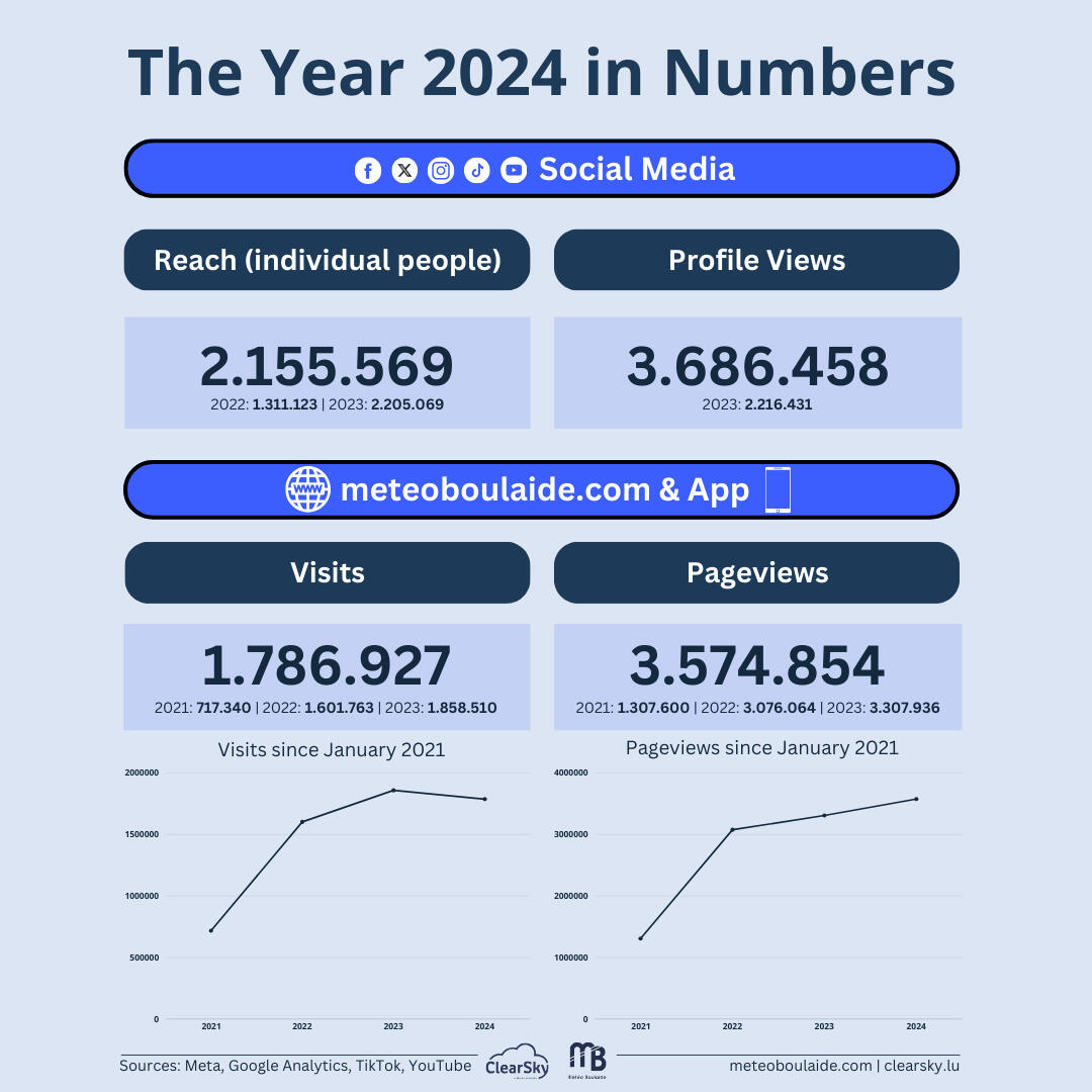Our website traffic has increased by over 123% since January 1st 2021.Our Météo Boulaide mobile app was released in October 2021 - which has been the catalyst for massive audience growth. The app was downloaded over 10,000 times in the first 4 days of its release.With over 100.000 followers on our social media accounts, we are able hit over 1.5 million impressions every month.