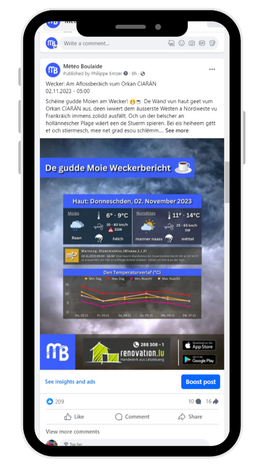 Météo Boulaide est le leader de la météo au Luxembourg depuis son lancement en décembre 2010. En plus de fournir des prévisions et alertes manuelles localisées, notre service est devenu une référence pour des milliers de Luxembourgeois chaque jour.Avec une forte présence sur les réseaux sociaux, des partenariats solides avec des médias comme Tageblatt, et une couverture nationale, Météo Boulaide veille sur votre sécurité depuis plus de 15 ans.Aujourd’hui, nous allons encore plus loin avec notre nouvelle application mobile, classée n°1 sur l’App Store au Luxembourg, pour vous offrir les meilleures informations météo, où que vous soyez.